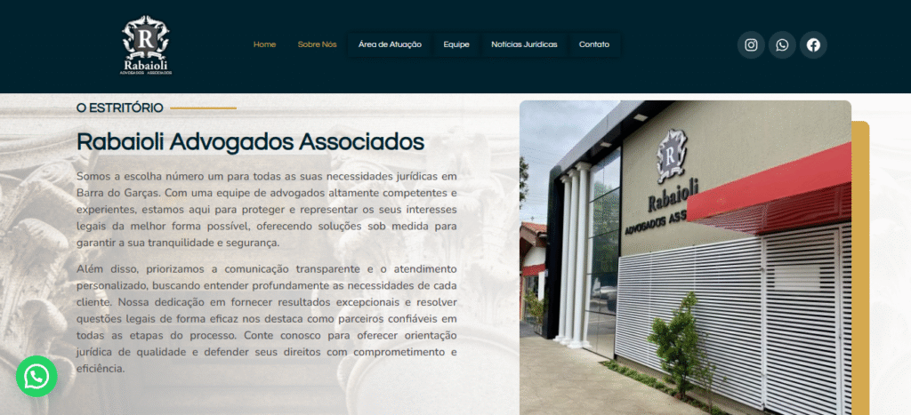 Projeto apresenta o desenvolvimento do website institucional para a Rabaioli Advogados Associados, um escritório posicionado como a escolha número um para todas as necessidades jurídicas em Barra do Garças. O objetivo foi construir uma presença digital que comunicasse a competência, a abrangência de atuação (full-service) e o comprometimento local da equipe.