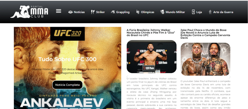 Portal MMA Club, um hub de informações dedicado aos entusiastas dos esportes de combate. Desenvolvi este portal com o objetivo de criar uma fonte de notícias ágil, confiável e abrangente, cobrindo o universo das lutas que vai muito além do MMA.