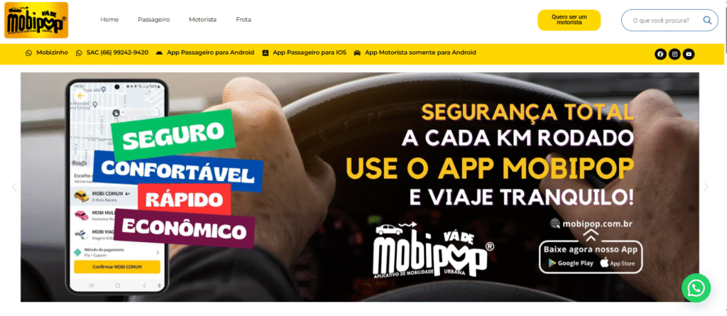 Este projeto apresenta o desenvolvimento do website institucional e promocional para a Mobipop – Uber Barra do Garças, uma empresa de tecnologia de transporte e aplicativo de mobilidade urbana que atua em Barra do Garças (MT), Aragarças (GO) e Pontal do Araguaia. O foco central do projeto foi traduzir a eficiência tecnológica e a prioridade na segurança em uma presença digital convincente.